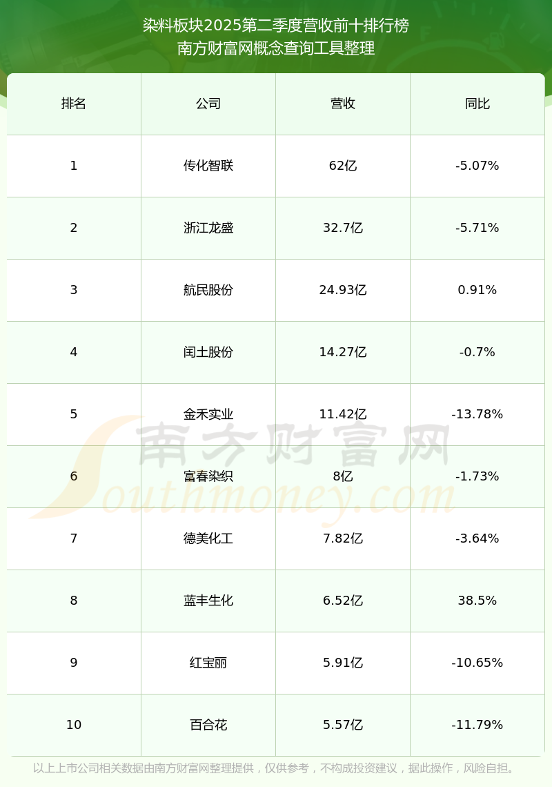 按照南方財富網(wǎng)概念查詢工具統(tǒng)計,該股所屬板塊為染料板塊,該板塊共有32只股票,浙江龍盛2025第二季度營收在該板塊中排名為第2名,該板塊2025第二季度營收排名前十的股票如下表: