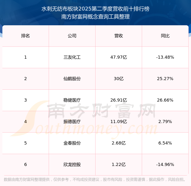 按照南方財富網(wǎng)概念查詢工具統(tǒng)計,該股所屬板塊為水刺無紡布板塊,該板塊共有6只股票,諾邦股份2025第二季度營收在該板塊中排名為第6名,該板塊2025第二季度營收排名前十的股票如下表: