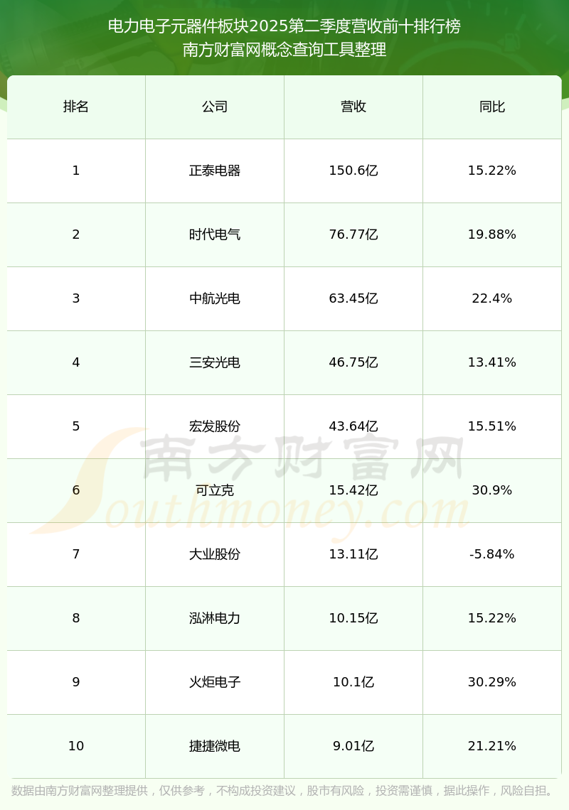 按照南方財(cái)富網(wǎng)概念查詢工具統(tǒng)計(jì),該股所屬板塊為電力電子元器件板塊,該板塊共有32只股票,新風(fēng)光2025第二季度營(yíng)收在該板塊中排名為第32名,該板塊2025第二季度營(yíng)收排名前十的股票如下表: