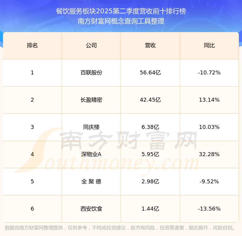 按照南方財(cái)富網(wǎng)概念查詢(xún)工具統(tǒng)計(jì),該股所屬板塊為餐飲服務(wù)板塊,該板塊共有6只股票,同慶樓2025第二季度營(yíng)收在該板塊中排名為第3名,該板塊2025第二季度營(yíng)收排名前十的股票如下表: