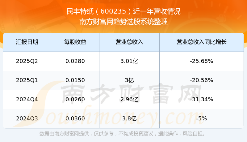 民豐特紙披露了2025年第二季度財(cái)報(bào)。報(bào)告顯示,民豐特紙2025年第二季度實(shí)現(xiàn)營(yíng)收3.01億元,同比-25.68%;歸母凈利潤(rùn)997.15萬(wàn)元,同比-37.66%。