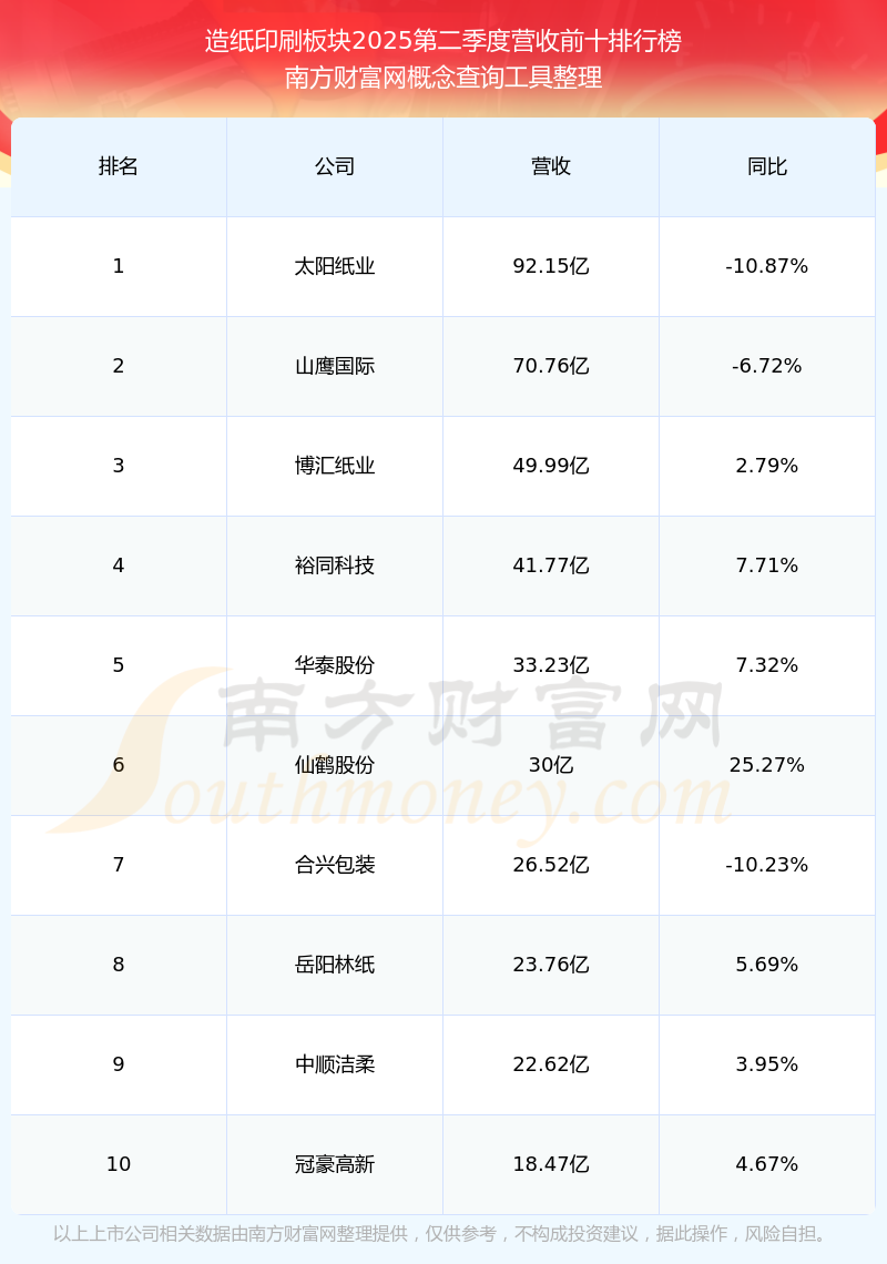 按照南方財(cái)富網(wǎng)概念查詢工具統(tǒng)計(jì),該股所屬板塊為造紙印刷板塊,該板塊共有47只股票,民豐特紙2025第二季度營(yíng)收在該板塊中排名為第30名,該板塊2025第二季度營(yíng)收排名前十的股票如下表: