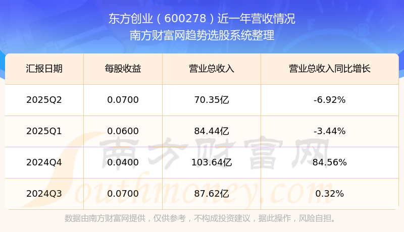 東方創(chuàng)業(yè)2025年第二季度顯示,公司主營收入70.35億元,同比-6.92%;歸母凈利潤6077.23萬元,同比-12.84%;扣非凈利潤6481萬元,同比-1.48%;