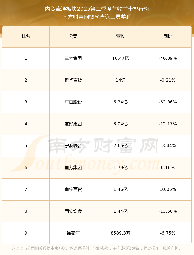 按照南方財富網(wǎng)概念查詢工具統(tǒng)計,該股所屬板塊為內(nèi)貿(mào)流通板塊,該板塊共有9只股票,東方創(chuàng)業(yè)2025第二季度營收在該板塊中排名為第9名,該板塊2025第二季度營收排名前十的股票如下表:
