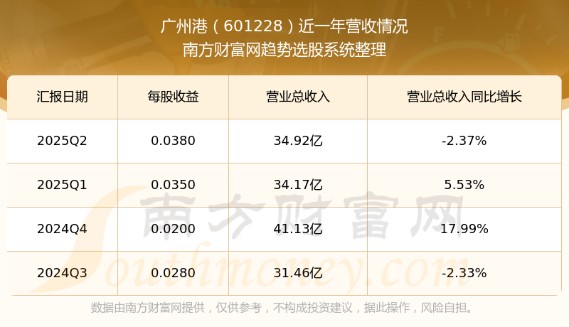 廣州港2025年第二季度顯示,公司主營(yíng)收入34.92億元,同比-2.37%;歸母凈利潤(rùn)2.9億元,同比0.14%;扣非凈利潤(rùn)2.71億元,同比-14.97%。