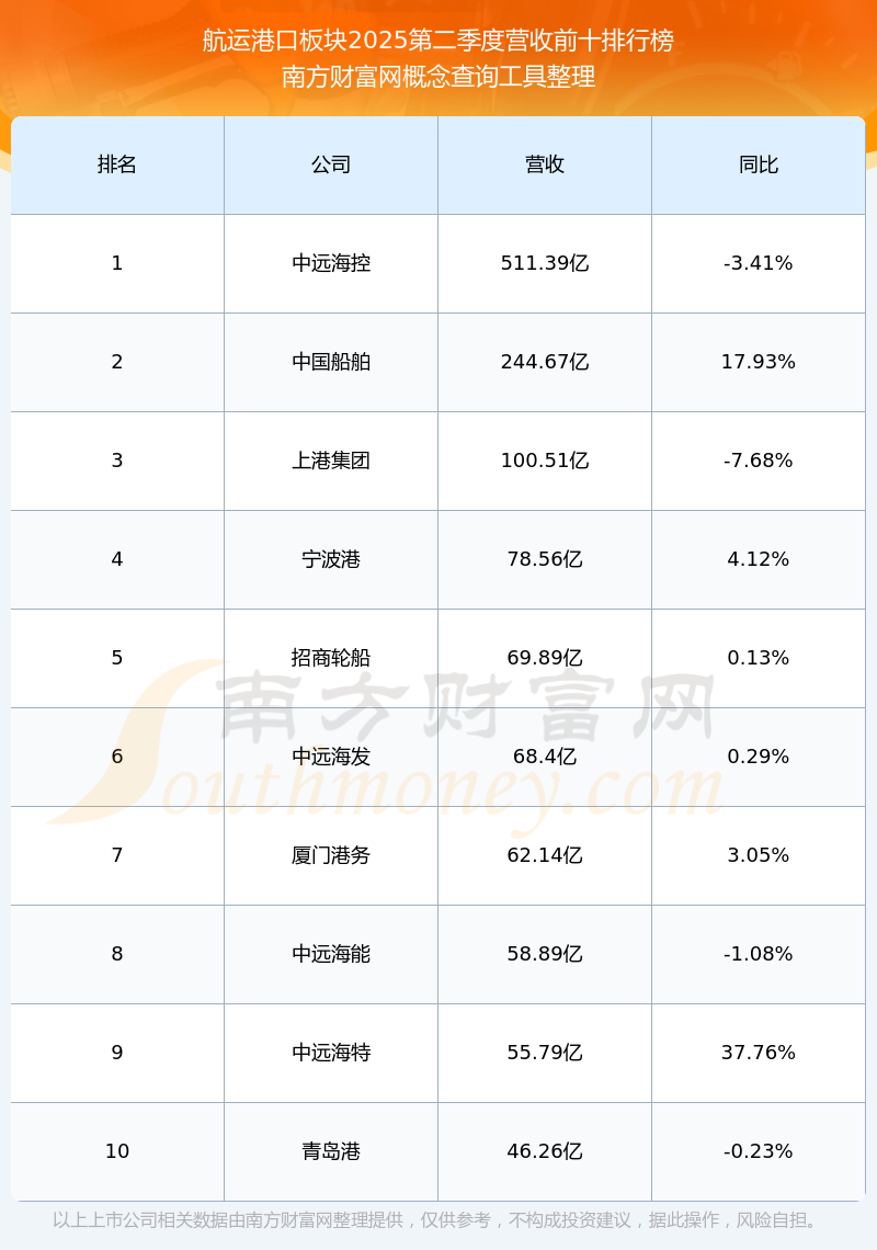 按照南方財(cái)富網(wǎng)概念查詢工具統(tǒng)計(jì),該股所屬板塊為航運(yùn)港口板塊,該板塊共有41只股票,廣州港2025第二季度營(yíng)收在該板塊中排名為第12名,該板塊2025第二季度營(yíng)收排名前十的股票如下表: