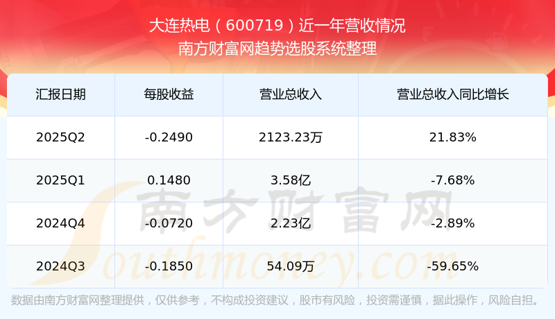 大連熱電2025年第二季度顯示,公司主營收入2123.23萬元,同比21.83%;歸母凈利潤-1億元,同比-50.76%;扣非凈利潤-1.02億元,同比-48.68%;