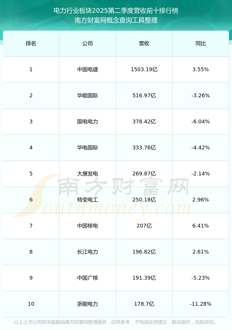 按照南方財富網(wǎng)概念查詢工具統(tǒng)計,該股所屬板塊為電力行業(yè)板塊,該板塊共有93只股票,大連熱電2025第二季度營收在該板塊中排名為第93名,該板塊2025第二季度營收排名前十的股票如下表: