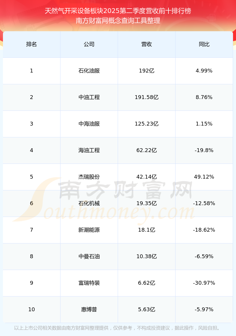 按照南方財(cái)富網(wǎng)概念查詢工具統(tǒng)計(jì),該股所屬板塊為天然氣開采設(shè)備板塊,該板塊共有17只股票,迪威爾2025第二季度營收在該板塊中排名為第17名,該板塊2025第二季度營收排名前十的股票如下表: