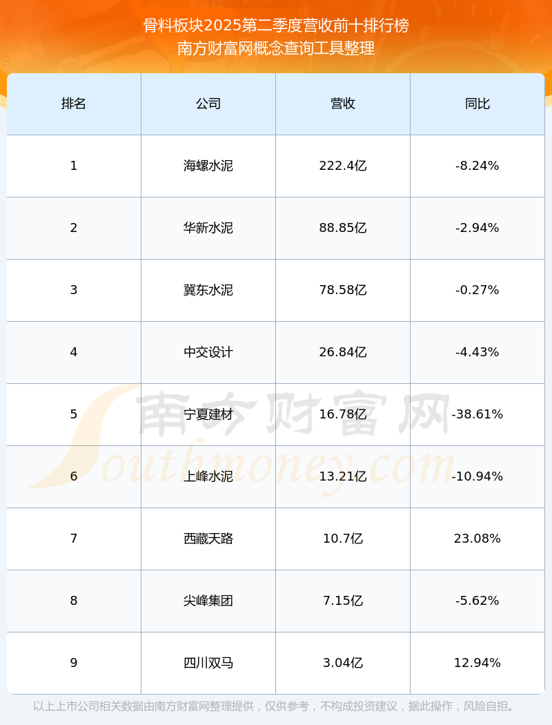 按照南方財富網(wǎng)概念查詢工具統(tǒng)計,該股所屬板塊為骨料板塊,該板塊共有9只股票,海螺水泥2025第二季度營收在該板塊中排名為第1名,該板塊2025第二季度營收排名前十的股票如下表: