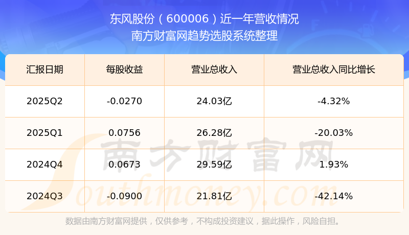 東風(fēng)股份(600006)發(fā)布2025年第二季度財(cái)報(bào)。2025年第二季度東風(fēng)股份實(shí)現(xiàn)營(yíng)業(yè)收入24.03億元,同比增加-4.32元%,環(huán)比增加-8.58%;凈利潤(rùn)為-5400.65萬元,同比增長(zhǎng)27.73%,環(huán)比增長(zhǎng)-135.72%。