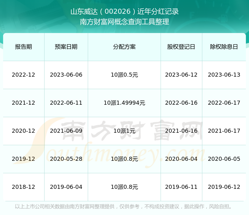 山東威達(dá)最新一次公布的分紅方案為10派0.5元。本次權(quán)益分派股權(quán)登記日為2023年6月12日,除權(quán)除息日為2023年6月13日,派息日為2023年6月13日。
