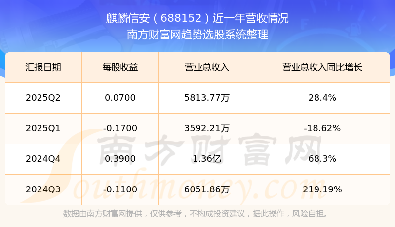 麒麟信安(688152)披露2025年第二季度報告,報告期實現(xiàn)營收5813.77萬元,同比28.4%;歸母凈利潤329.72萬元,同比145.34%;扣非凈利潤-1011.36萬元,同比8.98%。