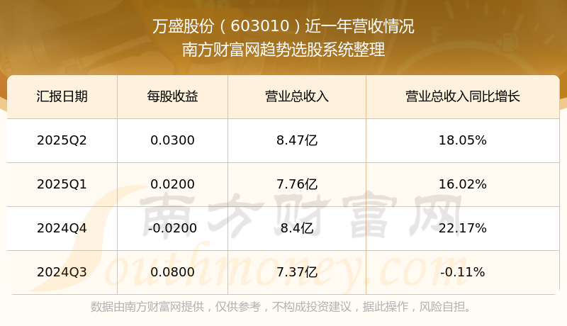 萬盛股份披露了2025年第二季度財(cái)報(bào)。報(bào)告顯示,萬盛股份2025年第二季度實(shí)現(xiàn)營收8.47億元,同比18.05%;歸母凈利潤1668.72萬元,同比-43.72%。