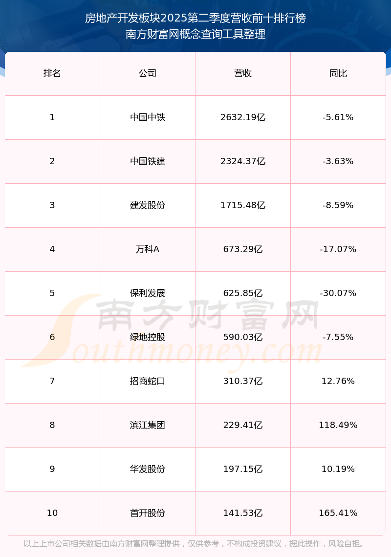 按照南方財富網(wǎng)概念查詢工具統(tǒng)計,該股所屬板塊為房地產(chǎn)開發(fā)板塊,該板塊共有143只股票,城投控股2025第二季度營收在該板塊中排名為第20名,該板塊2025第二季度營收排名前十的股票如下表: