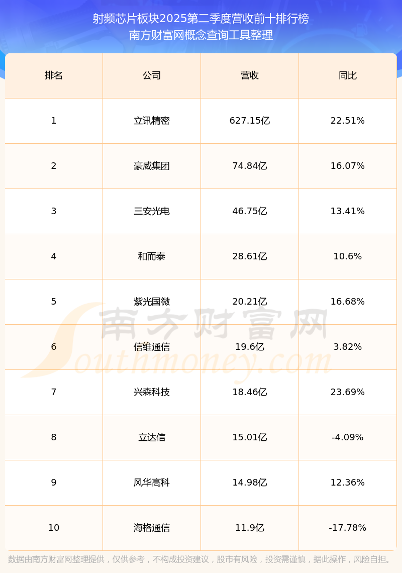 按照南方財富網(wǎng)概念查詢工具統(tǒng)計,該股所屬板塊為射頻芯片板塊,該板塊共有57只股票,國博電子2025第二季度營收在該板塊中排名為第24名,該板塊2025第二季度營收排名前十的股票如下表: