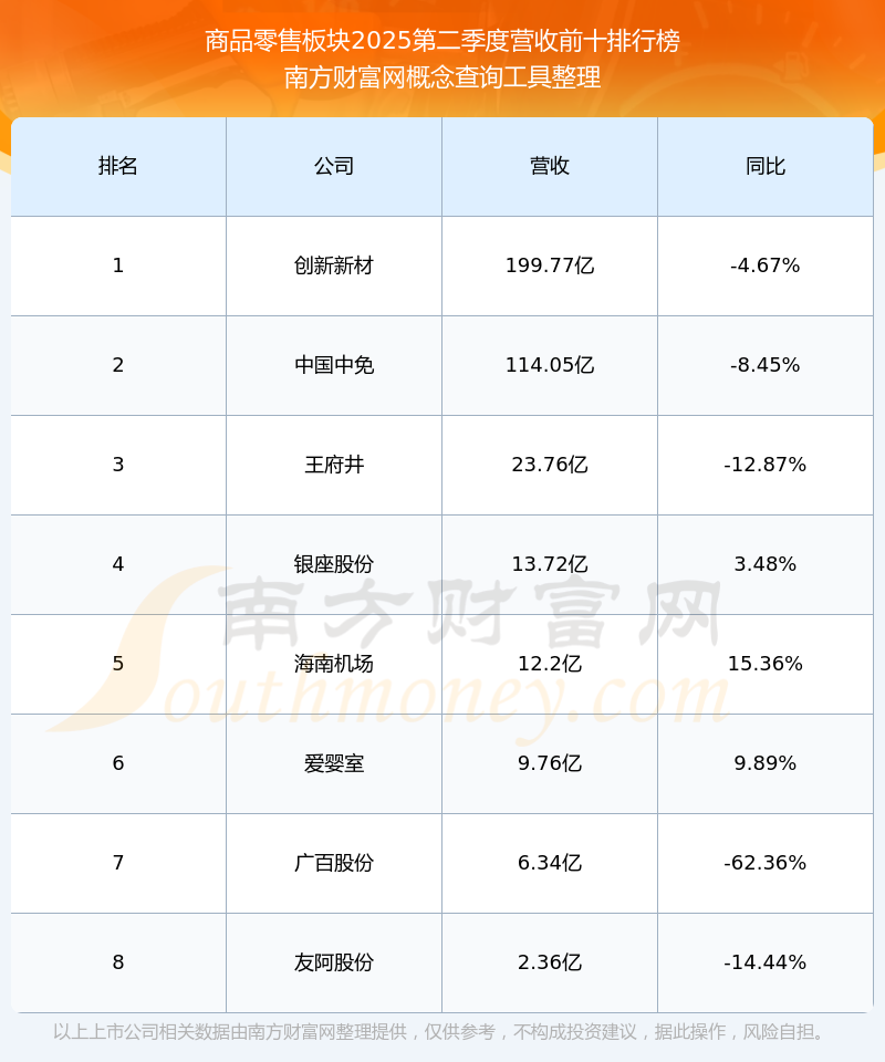 按照南方財富網概念查詢工具統(tǒng)計,該股所屬板塊為商品零售板塊,該板塊共有8只股票,百大集團2025第二季度營收在該板塊中排名為第8名,該板塊2025第二季度營收排名前十的股票如下表: