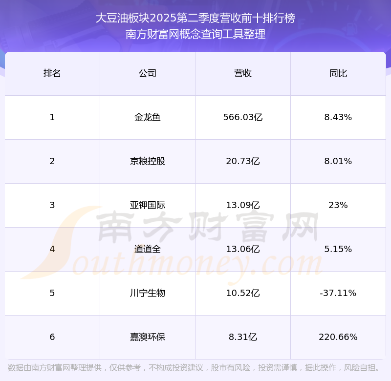 按照南方財富網概念查詢工具統(tǒng)計,該股所屬板塊為大豆油板塊,該板塊共有6只股票,索寶蛋白2025第二季度營收在該板塊中排名為第6名,該板塊2025第二季度營收排名前十的股票如下表:
