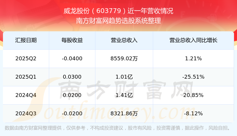 威龍股份2025年第二季度顯示,公司主營(yíng)收入8559.02萬(wàn)元,同比1.21%;歸母凈利潤(rùn)-1111.69萬(wàn)元,同比-23.27%;扣非凈利潤(rùn)-1113.08萬(wàn)元,同比-24.87%;