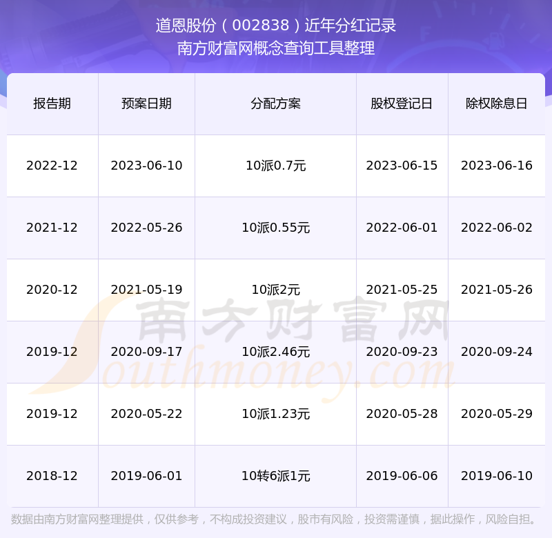 道恩股份最新一次公布的分紅方案為10派0.7元。本次權(quán)益分派股權(quán)登記日為2023年6月15日,除權(quán)除息日為2023年6月16日,派息日為2023年6月16日。