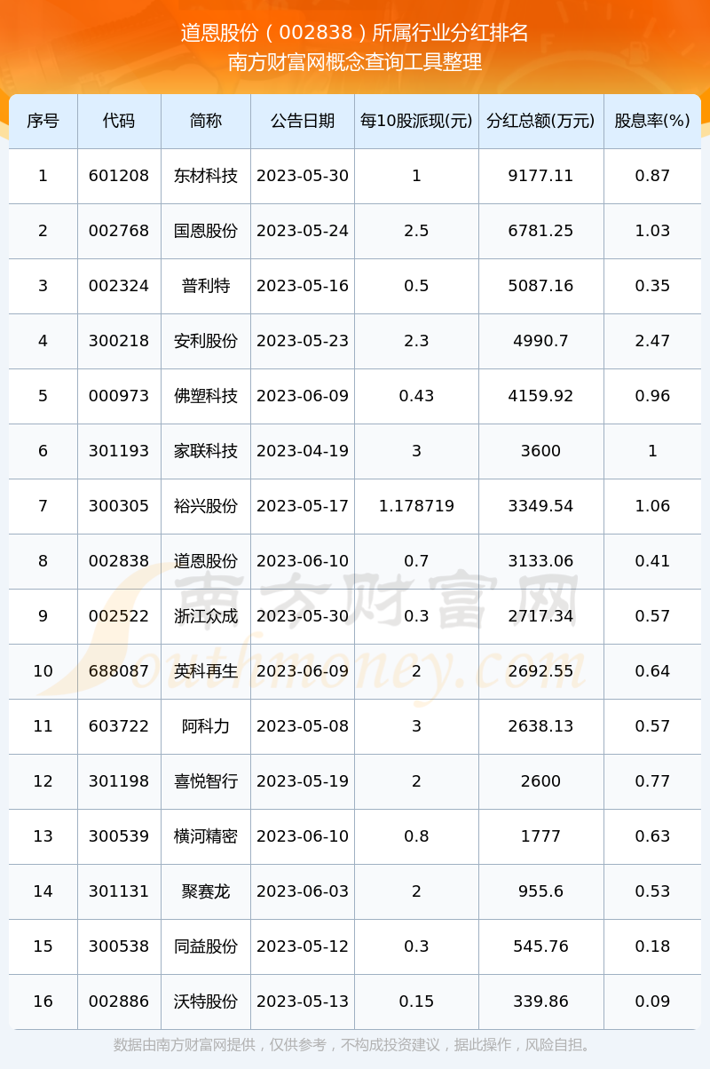 按照南方財富網(wǎng)趨勢選股系統(tǒng)統(tǒng)計,道恩股份所屬行業(yè)為塑料制品行業(yè),塑料制品行業(yè)分紅排名情況如下表: