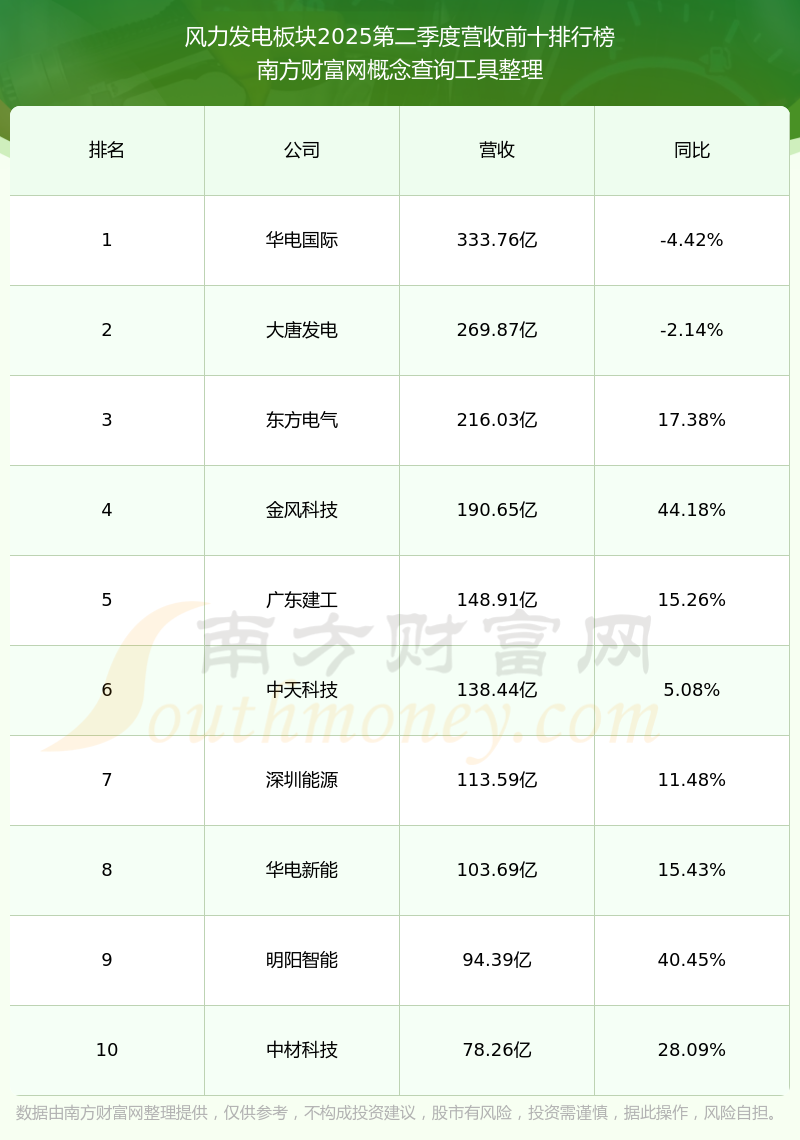 按照南方財(cái)富網(wǎng)概念查詢工具統(tǒng)計(jì),該股所屬板塊為風(fēng)力發(fā)電板塊,該板塊共有48只股票,三峽能源2025第二季度營(yíng)收在該板塊中排名為第48名,該板塊2025第二季度營(yíng)收排名前十的股票如下表: