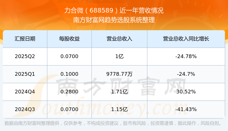 力合微2025年第二季度顯示,公司主營收入1億元,同比-24.78%;歸母凈利潤1225.25萬元,同比-35.03%;扣非凈利潤885.85萬元,同比-48.27%;