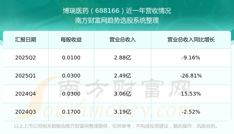在2025年第二季度,博瑞醫(yī)藥的業(yè)績表現(xiàn),主營業(yè)務(wù)收入達(dá)到2.88億元,實(shí)現(xiàn)了-9.16%的同比增長率。同時(shí),公司歸母凈利潤錄得421.34萬元,同比增長-90.04%。