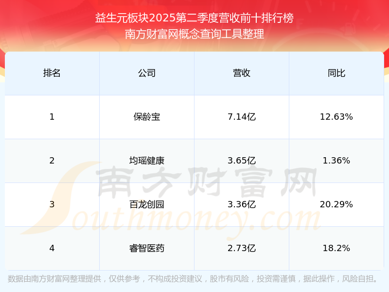 按照南方財(cái)富網(wǎng)概念查詢工具統(tǒng)計(jì),該股所屬板塊為益生元板塊,該板塊共有4只股票,百龍創(chuàng)園2025第二季度營(yíng)收在該板塊中排名為第3名,該板塊2025第二季度營(yíng)收排名前十的股票如下表: