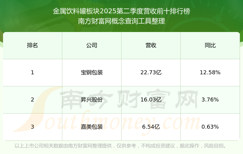 按照南方財(cái)富網(wǎng)概念查詢工具統(tǒng)計(jì),該股所屬板塊為金屬飲料罐板塊,該板塊共有3只股票,寶鋼包裝2025第二季度營收在該板塊中排名為第1名,該板塊2025第二季度營收排名前十的股票如下表: