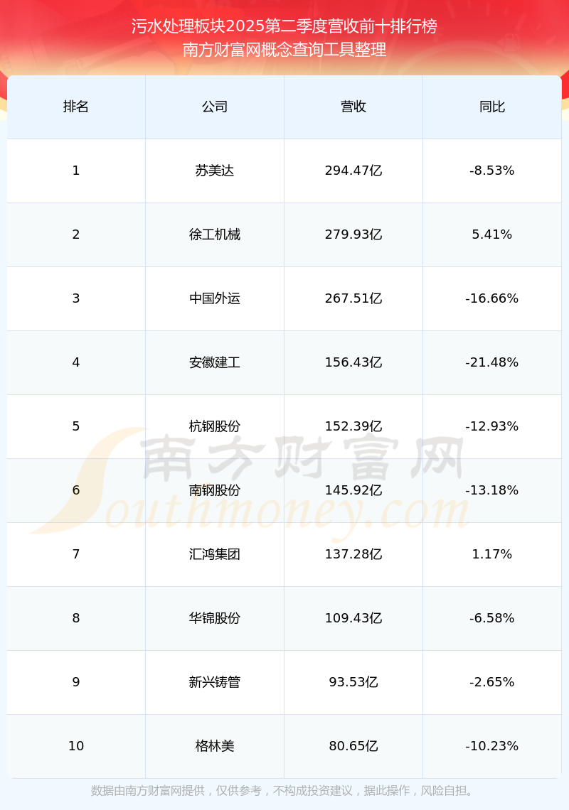 按照南方財(cái)富網(wǎng)概念查詢工具統(tǒng)計(jì),該股所屬板塊為污水處理板塊,該板塊共有202只股票,重慶水務(wù)2025第二季度營收在該板塊中排名為第37名,該板塊2025第二季度營收排名前十的股票如下表: