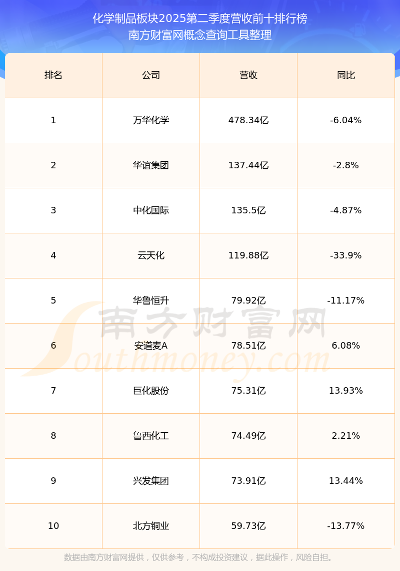 按照南方財(cái)富網(wǎng)概念查詢工具統(tǒng)計(jì),該股所屬板塊為化學(xué)制品板塊,該板塊共有226只股票,吉華集團(tuán)2025第二季度營(yíng)收在該板塊中排名為第132名,該板塊2025第二季度營(yíng)收排名前十的股票如下表: