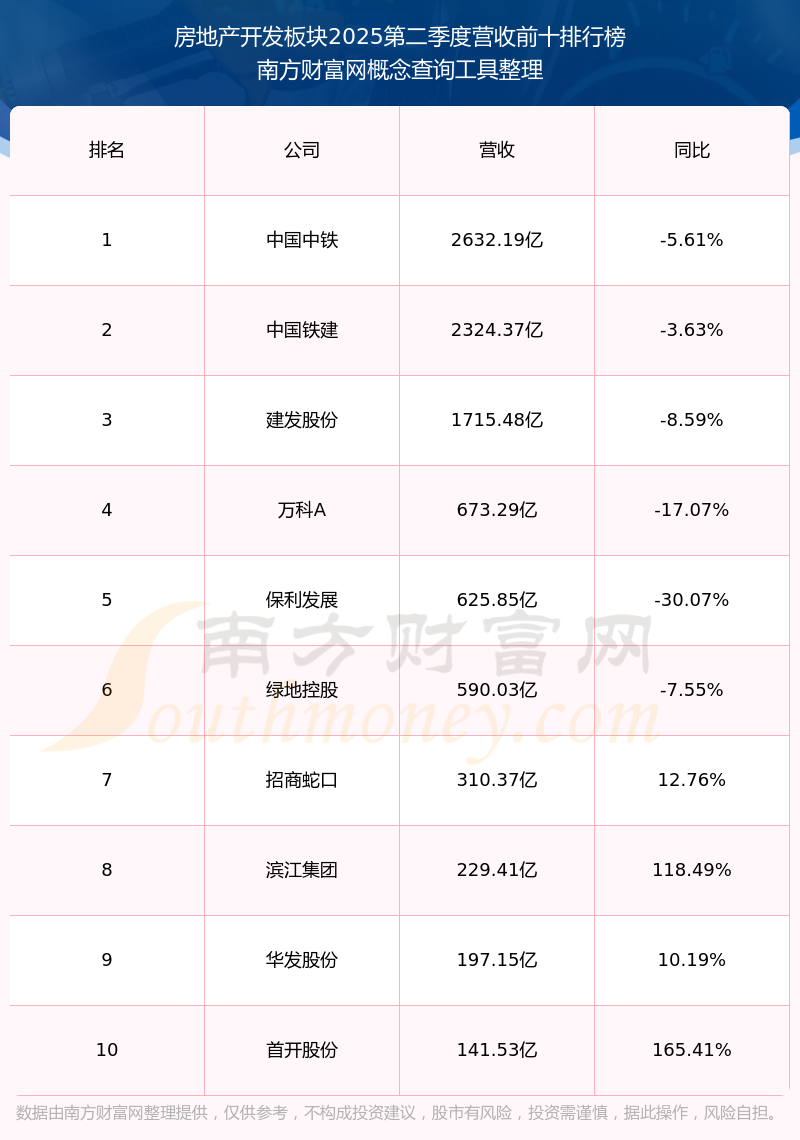 按照南方財富網(wǎng)概念查詢工具統(tǒng)計,該股所屬板塊為房地產(chǎn)開發(fā)板塊,該板塊共有143只股票,海泰發(fā)展2025第二季度營收在該板塊中排名為第140名,該板塊2025第二季度營收排名前十的股票如下表: