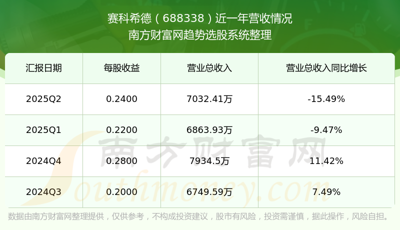 賽科希德2025年第二季度公司實現(xiàn)營業(yè)收入7032.41萬元,同比-15.49%;歸母凈利潤2486.7萬元,同比-23%。
