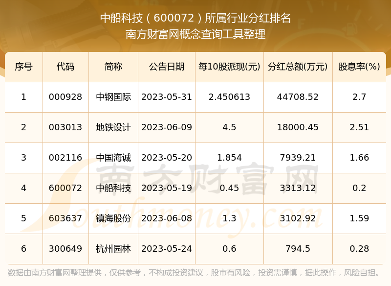 按照南方財(cái)富網(wǎng)趨勢(shì)選股系統(tǒng)統(tǒng)計(jì),中船科技所屬行業(yè)為工程承包行業(yè),工程承包行業(yè)分紅排名情況如下表: