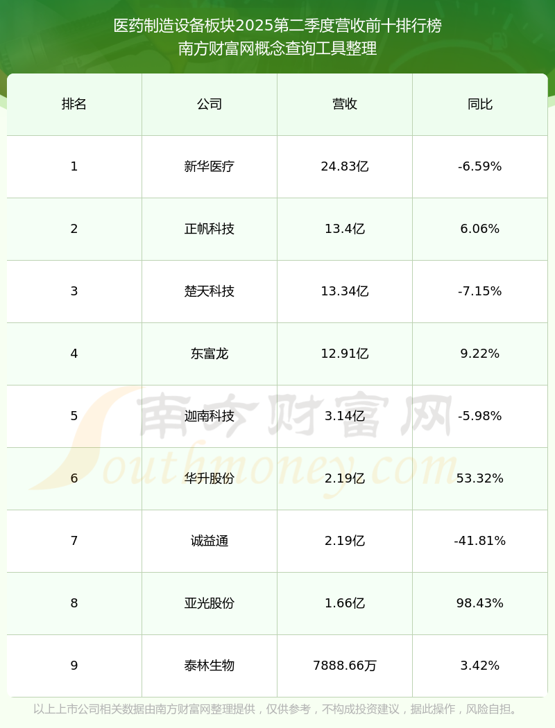 按照南方財(cái)富網(wǎng)概念查詢工具統(tǒng)計(jì),該股所屬板塊為醫(yī)藥制造設(shè)備板塊,該板塊共有9只股票,漢邦科技2025第二季度營(yíng)收在該板塊中排名為第9名,該板塊2025第二季度營(yíng)收排名前十的股票如下表: