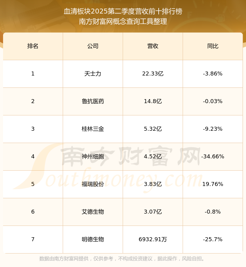 按照南方財富網(wǎng)概念查詢工具統(tǒng)計,該股所屬板塊為血清板塊,該板塊共有7只股票,賽倫生物2025第二季度營收在該板塊中排名為第7名,該板塊2025第二季度營收排名前十的股票如下表: