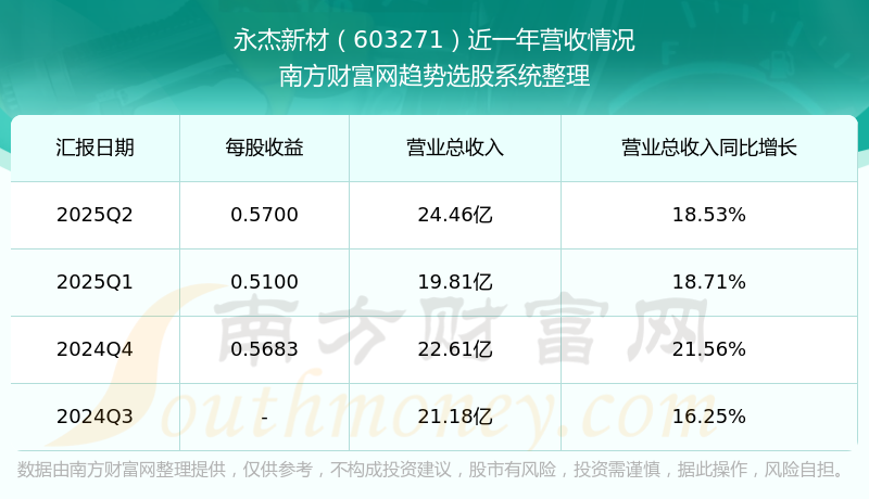 永杰新材2025年第二季度顯示,公司主營收入24.46億元,同比18.53%;歸母凈利潤1.1億元,同比13.53%;扣非凈利潤1.06億元,同比8.6%。
