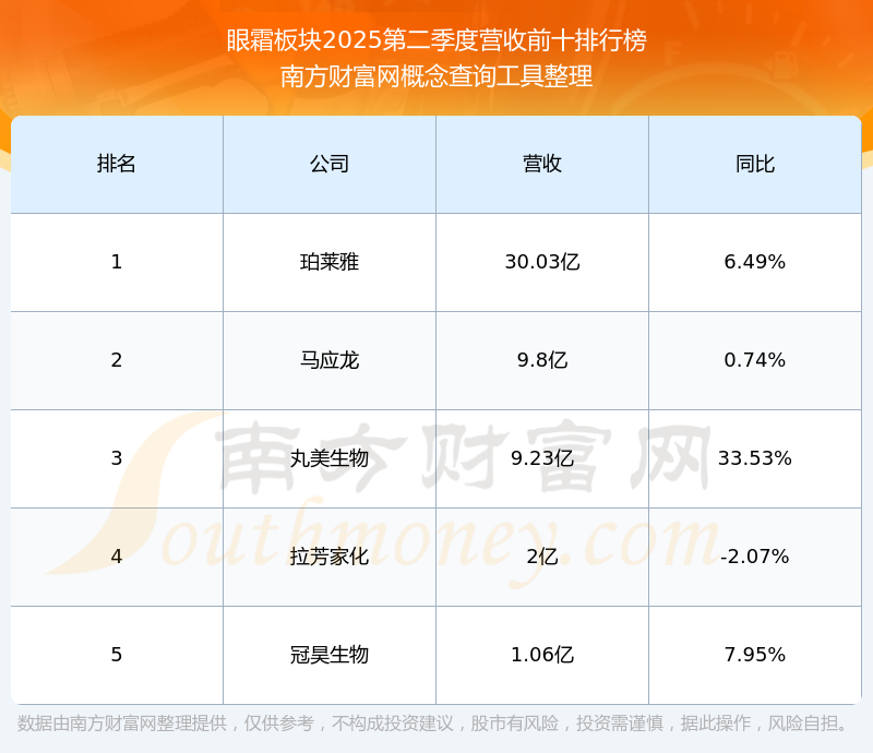 按照南方財富網(wǎng)概念查詢工具統(tǒng)計,該股所屬板塊為眼霜板塊,該板塊共有5只股票,丸美生物2025第二季度營收在該板塊中排名為第3名,該板塊2025第二季度營收排名前十的股票如下表: