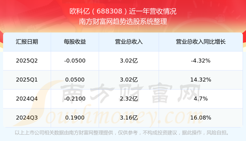歐科億發(fā)布2025年第二季度財(cái)報(bào)。實(shí)現(xiàn)總營收3.02億元,同比增長-4.32%;扣非凈利潤同比增長-183.64%至-2041.21萬元。