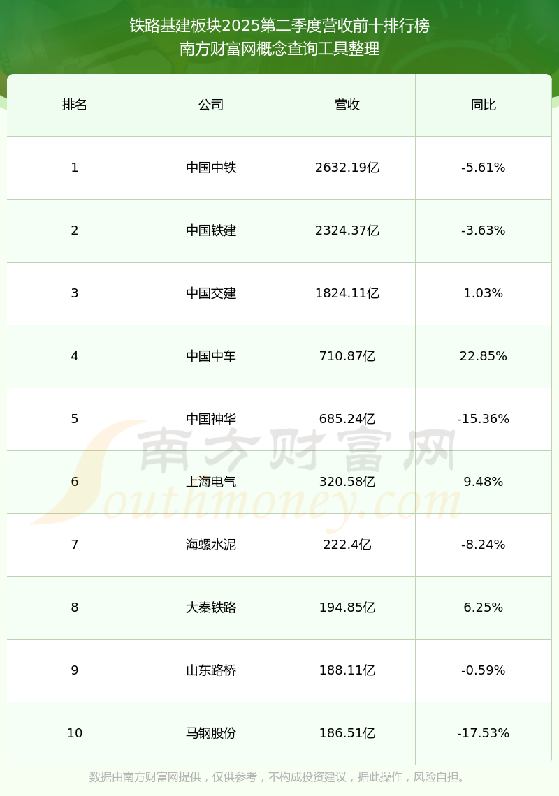 按照南方財富網(wǎng)概念查詢工具統(tǒng)計,該股所屬板塊為鐵路基建板塊,該板塊共有168只股票,馬鋼股份2025第二季度營收在該板塊中排名為第10名,該板塊2025第二季度營收排名前十的股票如下表: