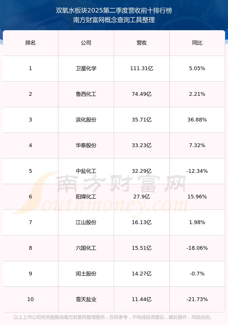 按照南方財富網(wǎng)概念查詢工具統(tǒng)計,該股所屬板塊為雙氧水板塊,該板塊共有21只股票,柳化股份2025第二季度營收在該板塊中排名為第21名,該板塊2025第二季度營收排名前十的股票如下表: