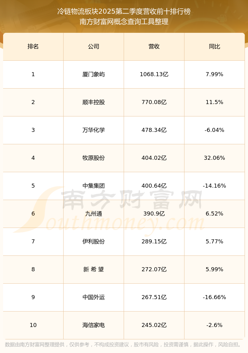 按照南方財富網(wǎng)概念查詢工具統(tǒng)計,該股所屬板塊為冷鏈物流板塊,該板塊共有145只股票,暢聯(lián)股份2025第二季度營收在該板塊中排名為第116名,該板塊2025第二季度營收排名前十的股票如下表: