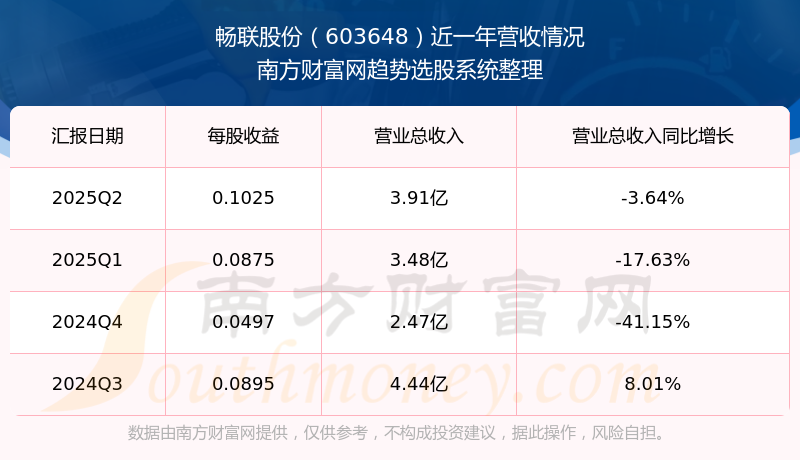 暢聯(lián)股份2025年第二季度財報顯示,公司主營收入3.91億元,同比-3.64%;歸母凈利潤3661.58萬元,同比-7.29%;扣非凈利潤2988.81萬元,同比-15.35%。