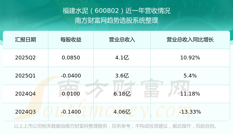 福建水泥(600802)發(fā)布2025年第二季度財報。2025年第二季度福建水泥實現(xiàn)營業(yè)收入4.1億元,同比增加10.92元%,環(huán)比增加13.68%;凈利潤為4058.58萬元,同比增長303.01%,環(huán)比增長303.76%。