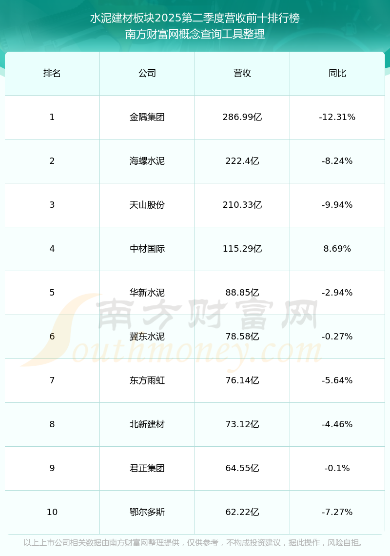 按照南方財富網(wǎng)概念查詢工具統(tǒng)計,該股所屬板塊為水泥建材板塊,該板塊共有48只股票,福建水泥2025第二季度營收在該板塊中排名為第34名,該板塊2025第二季度營收排名前十的股票如下表: