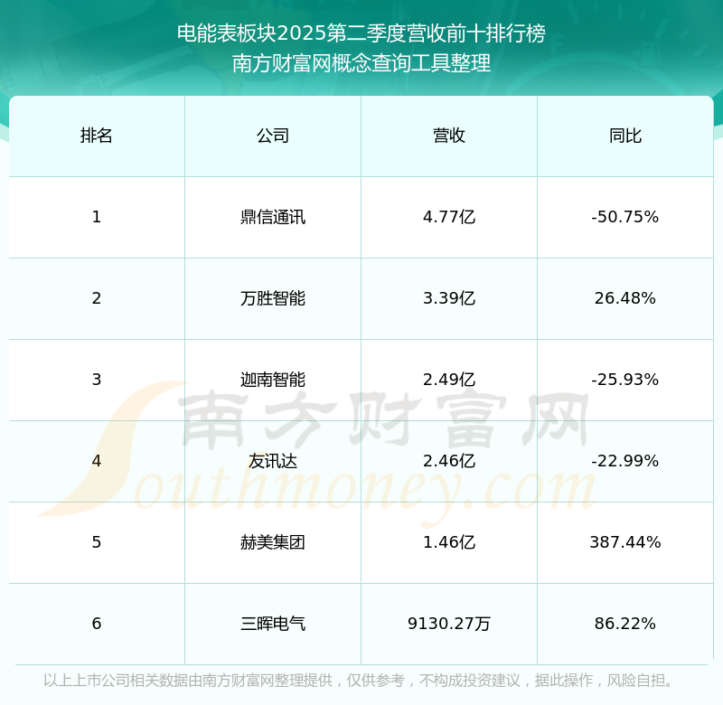 按照南方財(cái)富網(wǎng)概念查詢工具統(tǒng)計(jì),該股所屬板塊為電能表板塊,該板塊共有6只股票,鼎信通訊2025第二季度營(yíng)收在該板塊中排名為第1名,該板塊2025第二季度營(yíng)收排名前十的股票如下表: