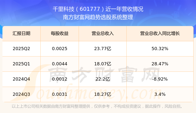 千里科技2025年第二季度顯示,公司主營(yíng)收入23.77億元,同比50.32%;歸母凈利潤(rùn)1112.61萬元,同比3.47%;扣非凈利潤(rùn)-1.57億元,同比-6173.3%。