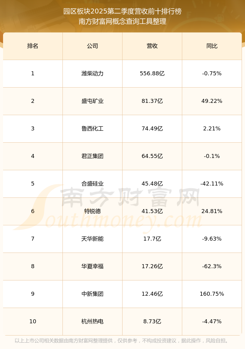 按照南方財富網(wǎng)概念查詢工具統(tǒng)計,該股所屬板塊為園區(qū)板塊,該板塊共有27只股票,中炬高新2025第二季度營收在該板塊中排名為第27名,該板塊2025第二季度營收排名前十的股票如下表: