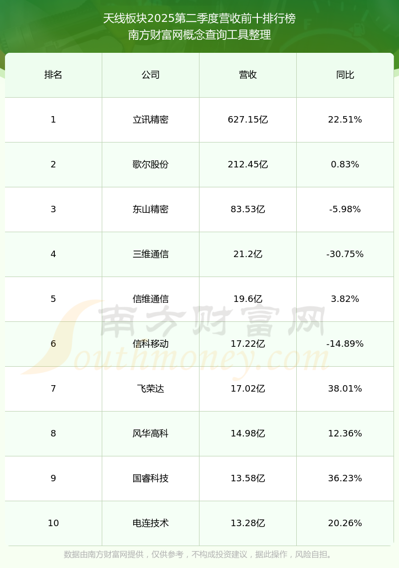 按照南方財(cái)富網(wǎng)概念查詢(xún)工具統(tǒng)計(jì),該股所屬板塊為天線板塊,該板塊共有38只股票,移遠(yuǎn)通信2025第二季度營(yíng)收在該板塊中排名為第38名,該板塊2025第二季度營(yíng)收排名前十的股票如下表: